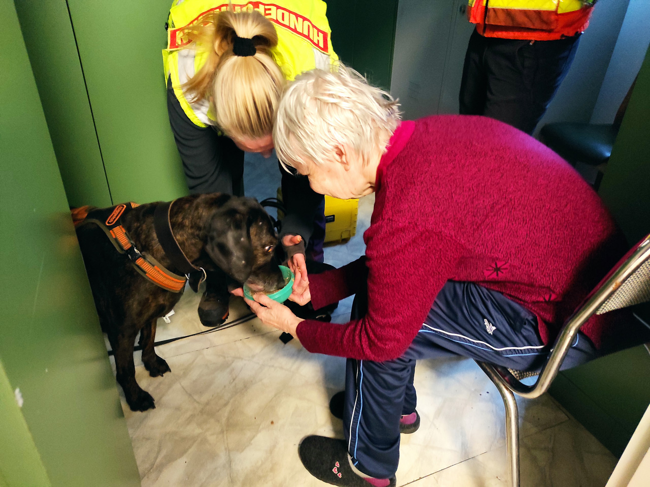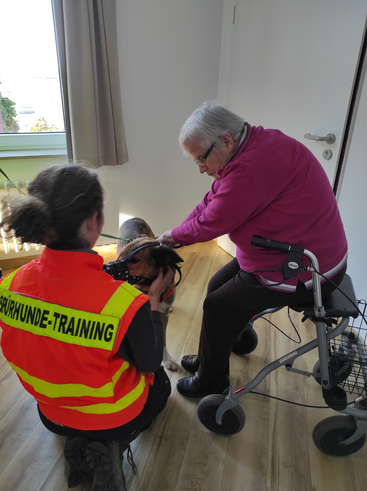 Am 31. Juli bekamen wir Besuch von der Hunderettungsstaffel Vockerode, die bei uns eine Trainingseinheit durchführen wollte. Dabei benötigten sie unsere Unterstützung, einige Bewohner wurden nacheinander an verschiedenen Orten im Haus und auf dem Gelände versteckt und dann begann das Training für die Hunde. Diese sollten nämlich mit einer vorher genommenen Geruchsprobe unsere Bewohner wiederfinden, natürlich wurden alle Verstecke entdeckt und die Freude war auf beiden Seiten groß bei der Begegnung Hund – Mensch. Zum Schluss kam noch das „Maskottchen“ der Rettungsstaffel zum Einsatz – ein kleiner Zwergpudel, der nochmal für Freude beim Knuddeln sorgte. Ein sehr interessanter und schöner Nachmittag, der hoffentlich bald wiederholt wird.