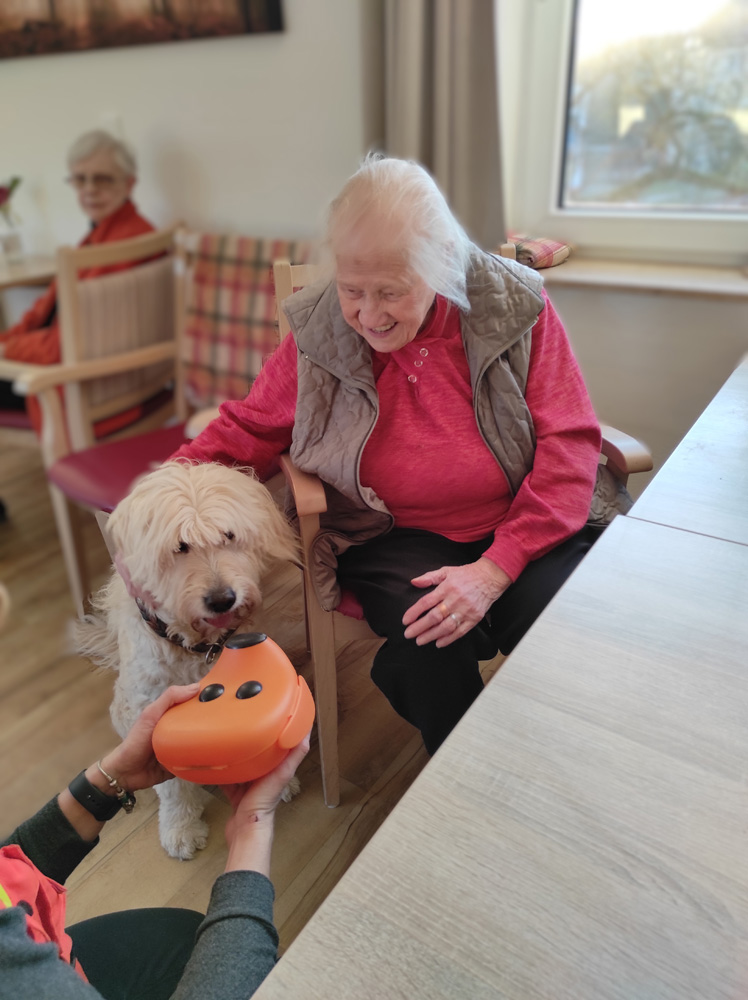 Im Amalienhof durften wir erneut ganz besondere Gäste begrüßen: Ein Team für Spürhundetraining führte bei uns einen Kurs durch und unsere Bewohner waren von Anfang an mit großer Begeisterung dabei. Bereits im Vorfeld herrschte gespannte Vorfreude, die spätestens dann in strahlende Gesichter überging, als die Hunde sie erfolgreich „aufspürten“ und sie die Tiere mit kleinen Leckereien belohnen durften. Natürlich kamen auch zahlreiche Streicheleinheiten nicht zu kurz.