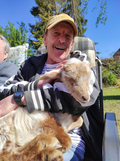 Harriet und Peter brachten ihre kleinen Zicklein und Lämmer mit in den Amalienhof. Harriet erzählte viel Interessantes über ihr Leben auf dem Bauernhof mit den ganzen Tieren und Peter sorgte für die musikalische Untermalung. Natürlich durften die Tierkinder auch geknuddelt werden und das ließen sich unsere Bewohner nicht zweimal sagen.
