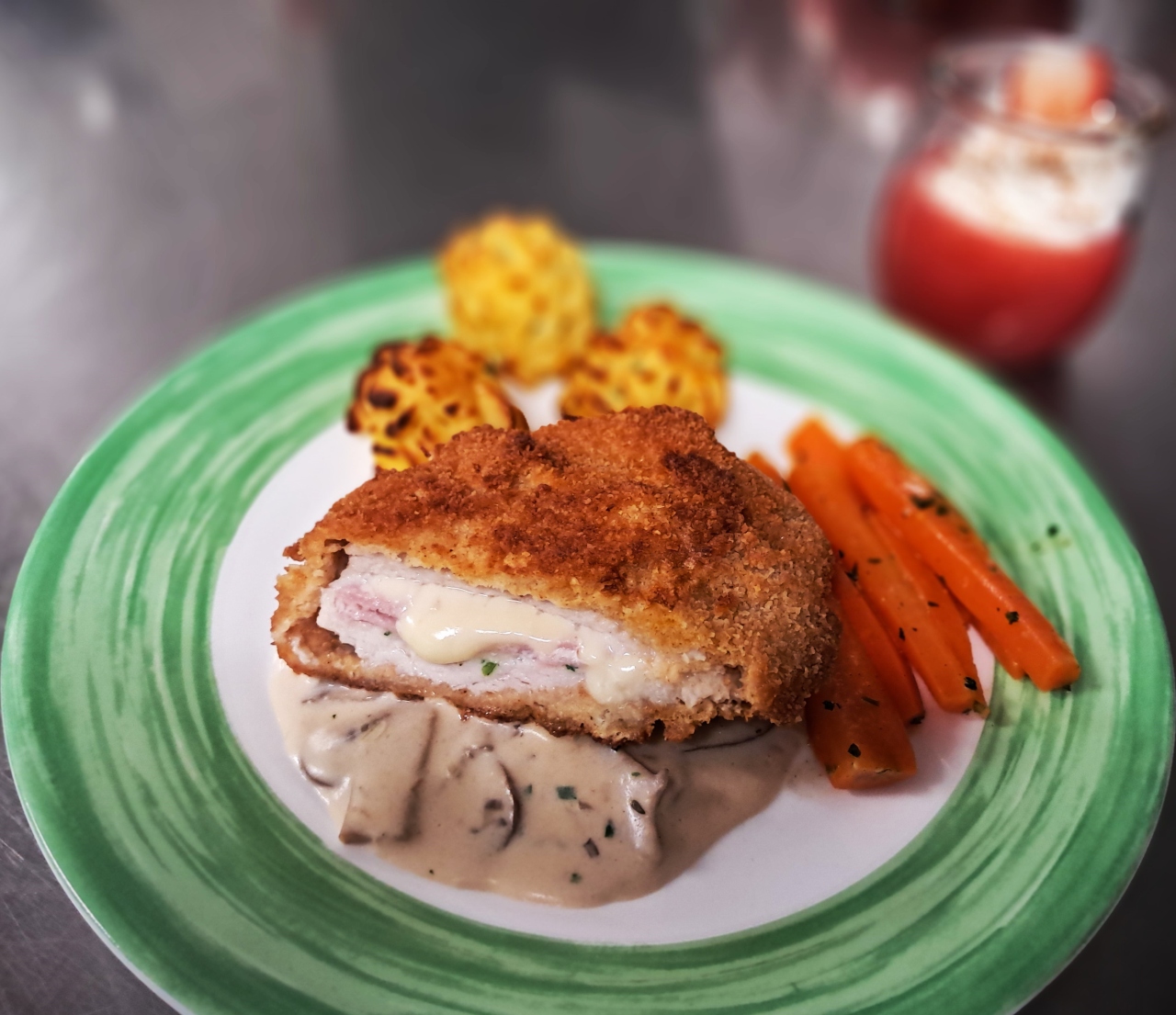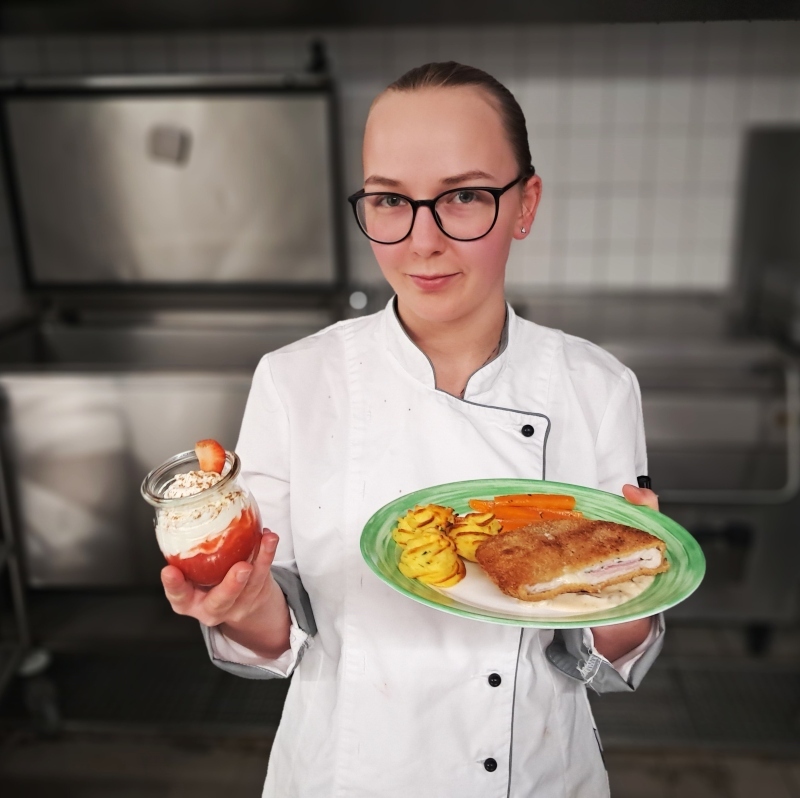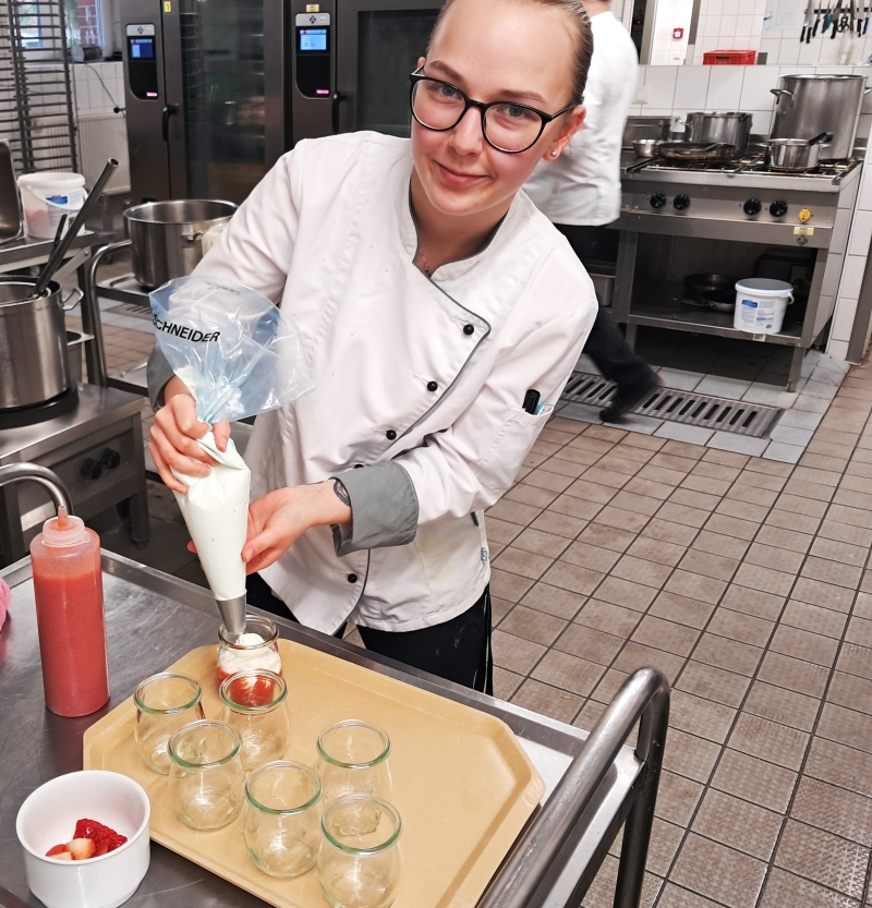 Im Rahmen der bevorstehenden Zwischenprüfung des zweiten Ausbildungsjahres hat unsere Auszubildende Lia Werner ein zweigängiges Menü aus einem vorgegebenen Warenkorb zubereitet. Das Menü bestand aus einem Hauptgericht, mit selbstgemachten Herzoginkartoffeln, Cordon Bleu auf einem Pilzbett und karamellisierten Möhren. Als Dessert wurde ein Erdbeersahnetraum serviert. Die Lehrunterweisung erfolgte durch unseren Küchenchef Matthias Nieling sowie durch Matthias Hahne, die wertvolle Tipps und Anregungen für die Zubereitung und Präsentation der Speisen gaben.